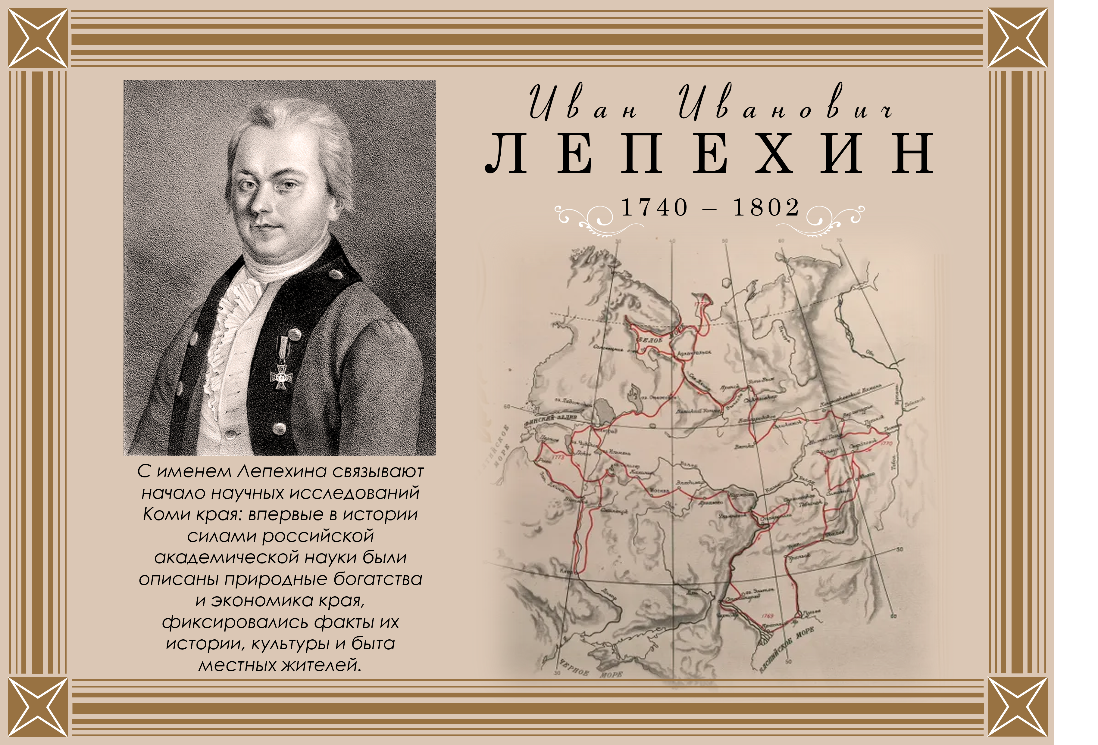 21 августа исполнилось 285 лет со дня рождения Ивана Ивановича Лепёхина — путешественника, натуралиста, академика Императорской академии наук и первого учёного, который подробно описал природу и жизнь на территории современной Республики Коми. Его труды стали важным вкладом в развитие науки и помогли представить наш край в научных кругах XVIII века.