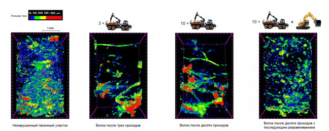 В рамках совместных исследований сотрудников Института биологии Коми НЦ УрО РАН и ФИЦ Почвенный институт имени В.В. Докучаева получены первые данные об изменении порового пространства подзолистых почв при воздействии тяжелой лесозаготовительной техники.