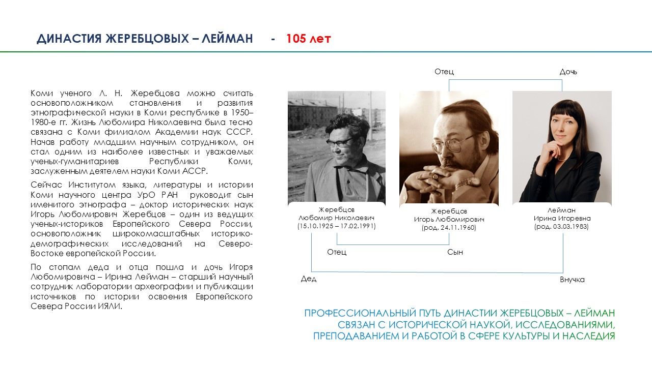 В Национальном музее Республики Коми состоялось открытие выставки «Научная династия», посвященной научной династии известных в России и за её пределами учёных, насчитывающей уже несколько поколений. Выставка приурочена к 100-летию со дня рождения к.и.н. Любомира Николаевича Жеребцова (1925−1991), одного из наиболее известных ученых Института языка, литературы и истории, внесшего огромный вклад в становление и развитие этнографических исследований в Коми филиале АН СССР, более четверти века возглавлявшего вначале группу этнографов филиала, а затем сектор этнографии ИЯЛИ. 15 октября 2025 г. ученому исполнилось бы 100 лет…