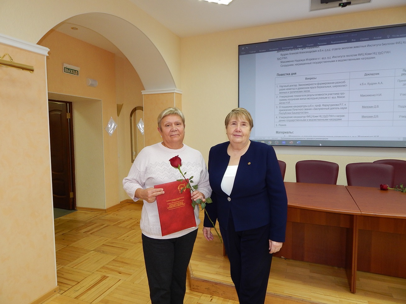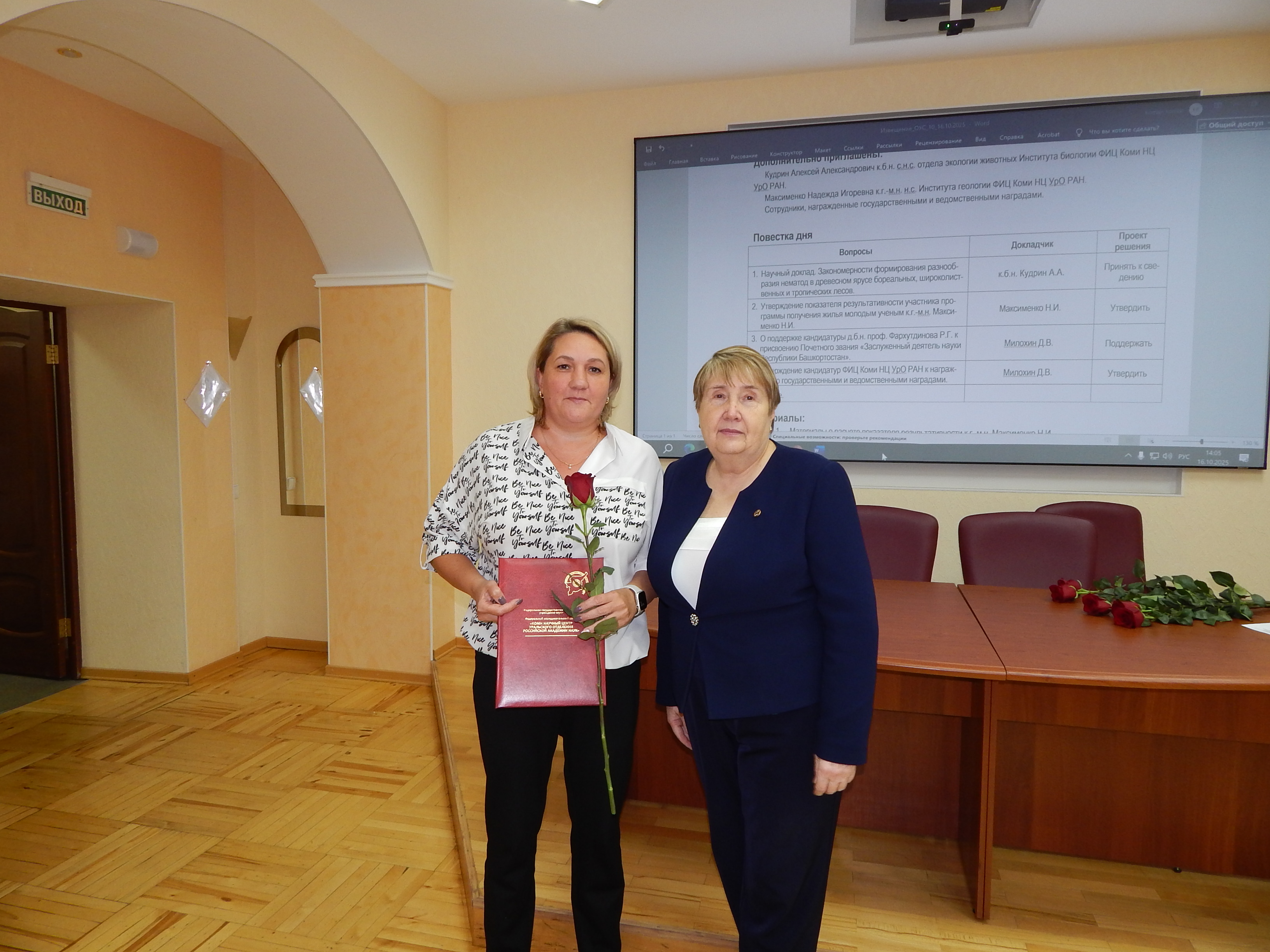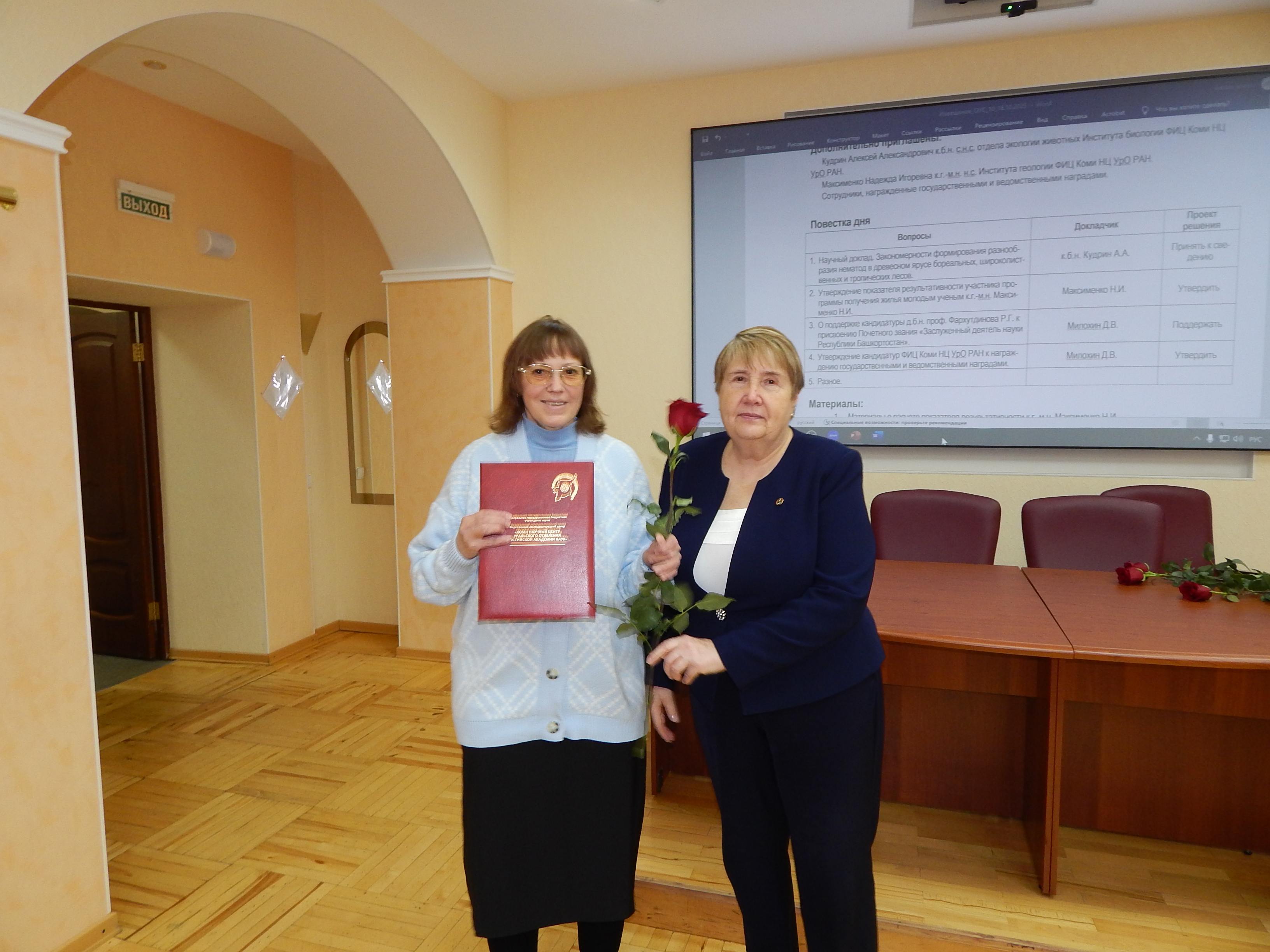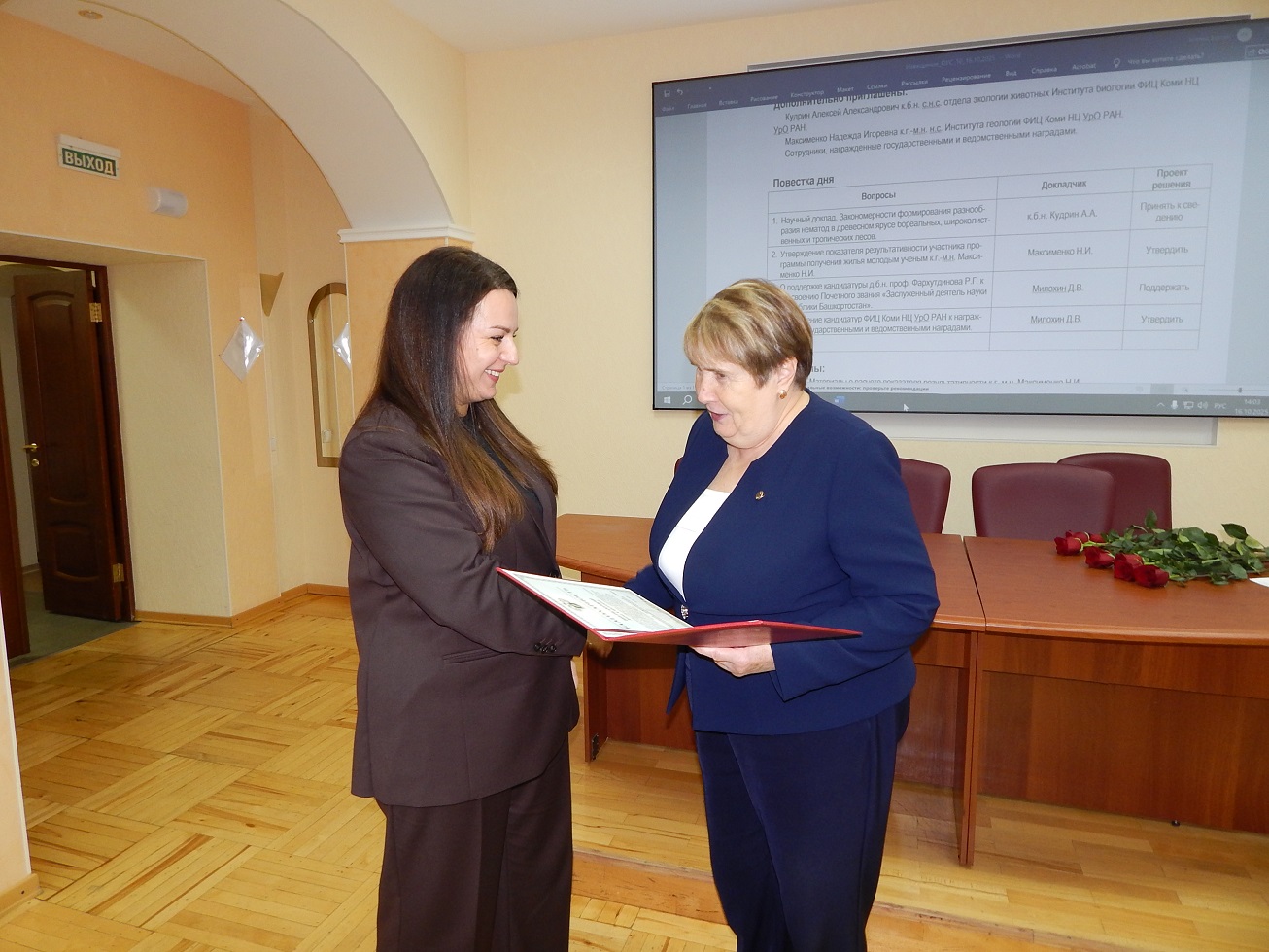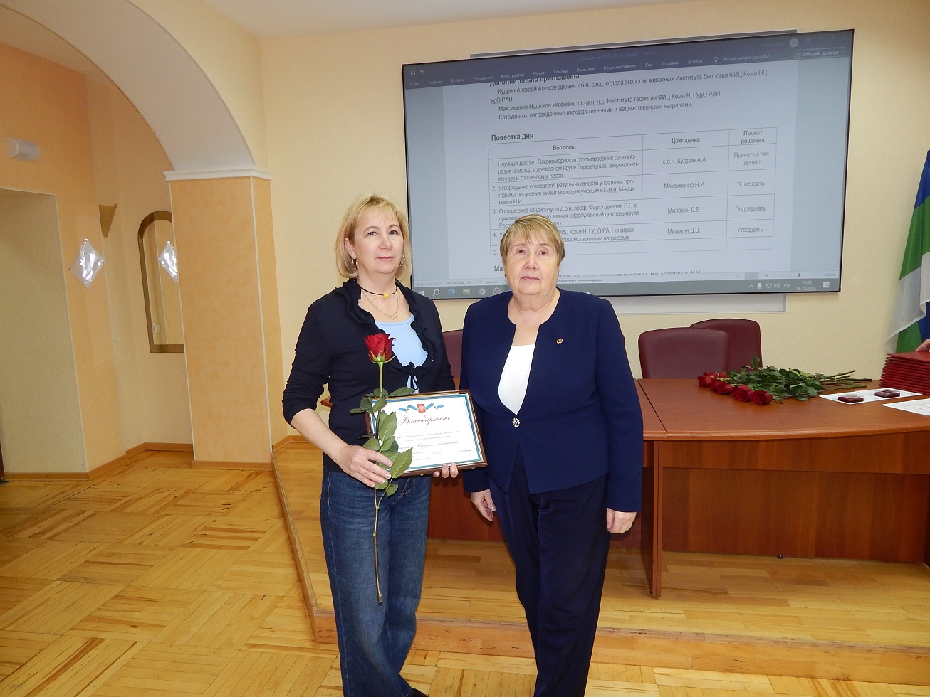 За многолетний добросовестный труд и большой вклад в развитие фундаментальных и прикладных исследований в области ихтиологии и гидробиологии Почетной грамотой УрО РАН награждена Соколова Наталья Петровна – Институт биологии Коми научного центра Уральского отделения Российской академии наук.