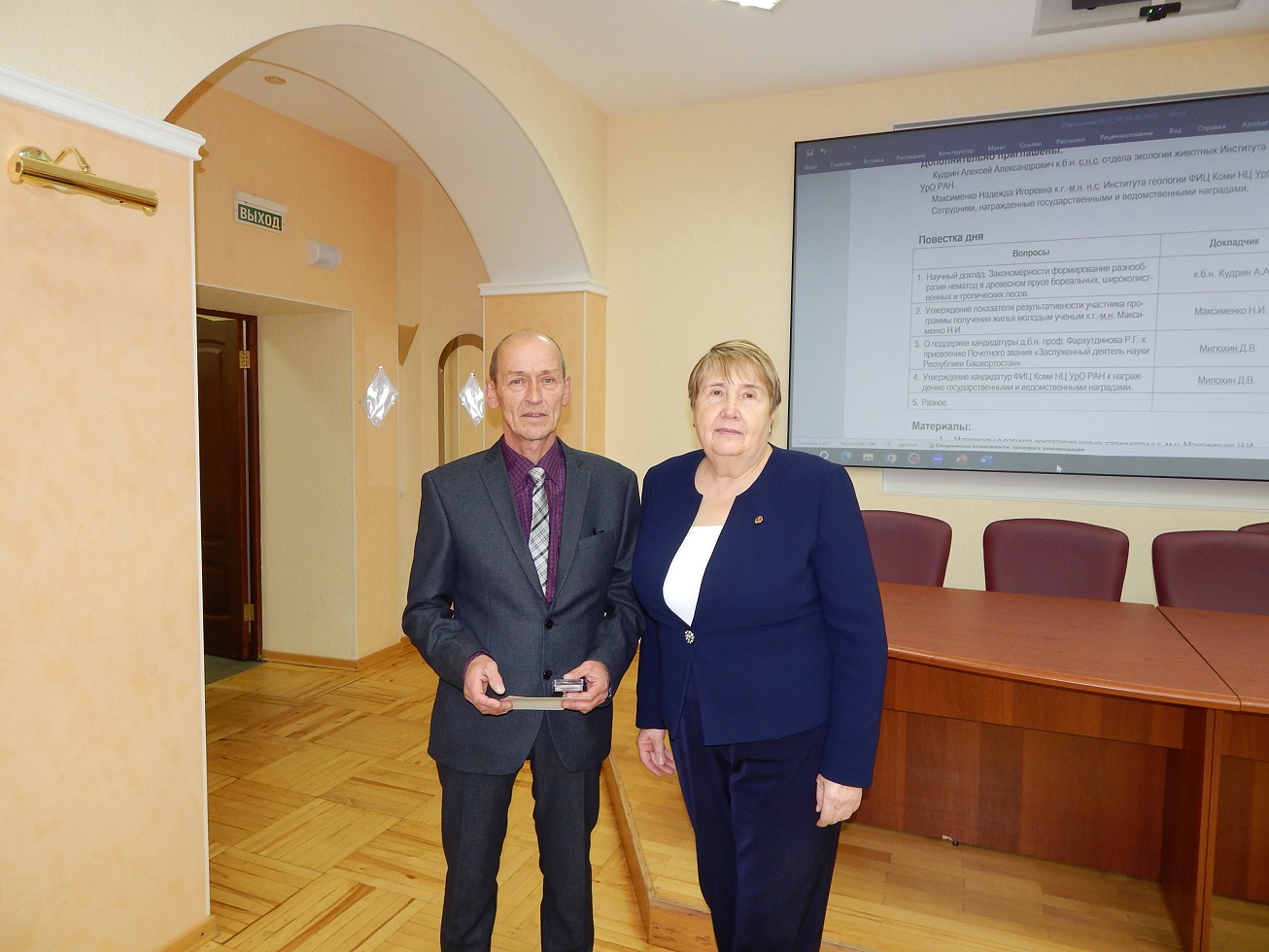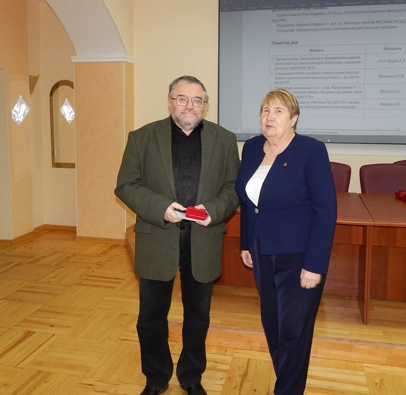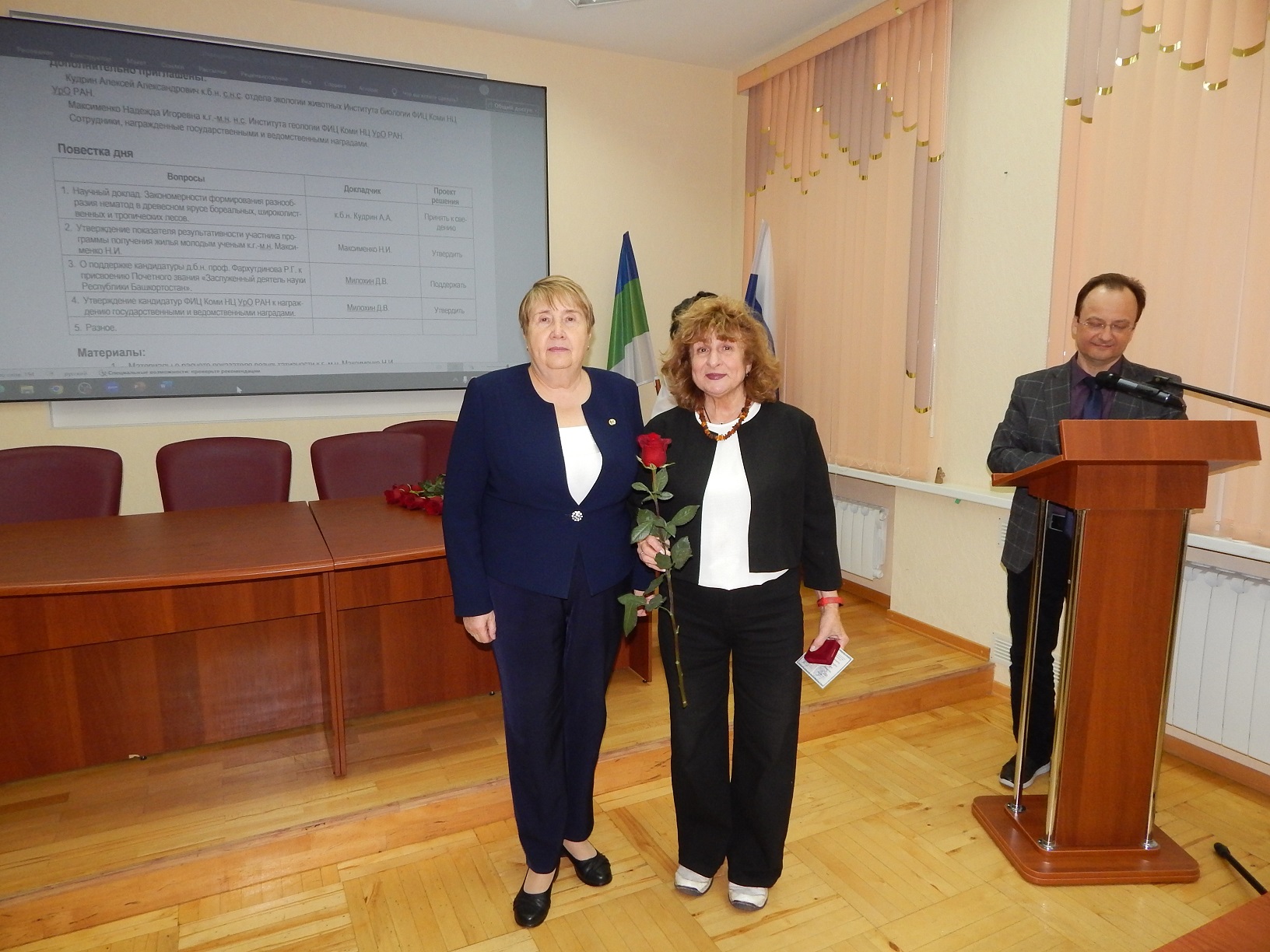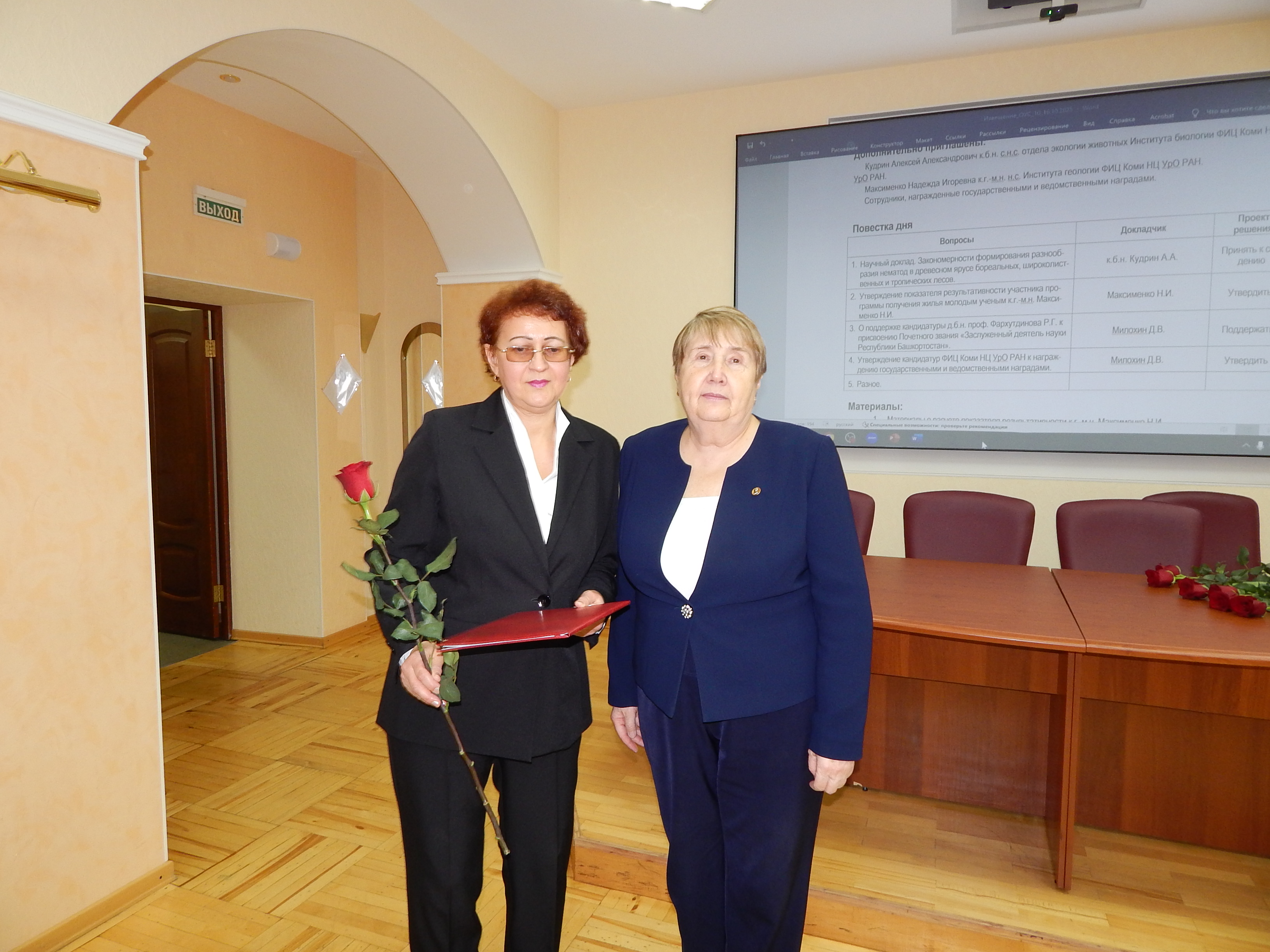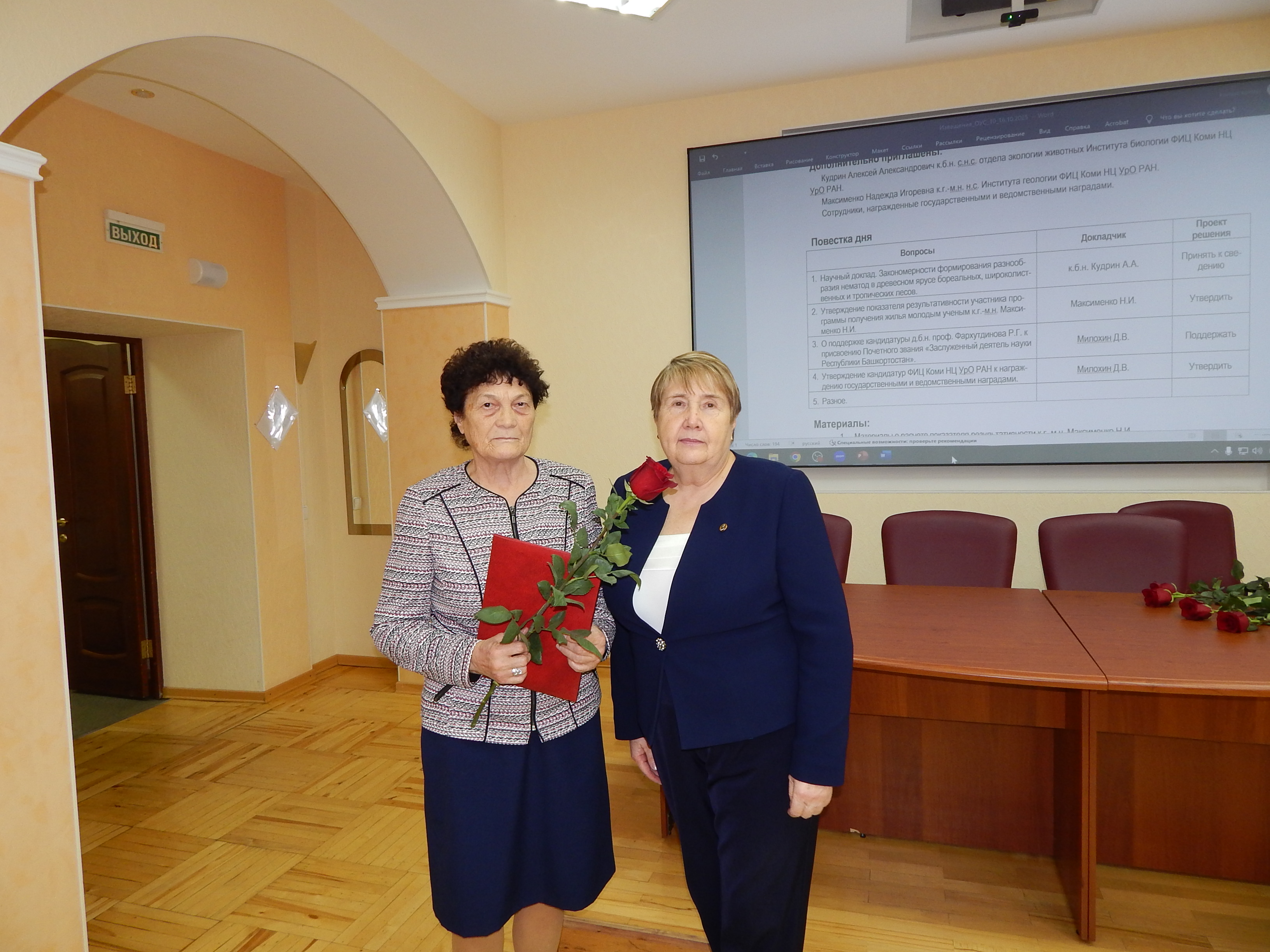 За многолетний добросовестный труд и большой вклад в развитие фундаментальных и прикладных исследований в области ихтиологии и гидробиологии Почетной грамотой УрО РАН награждена Соколова Наталья Петровна – Институт биологии Коми научного центра Уральского отделения Российской академии наук.