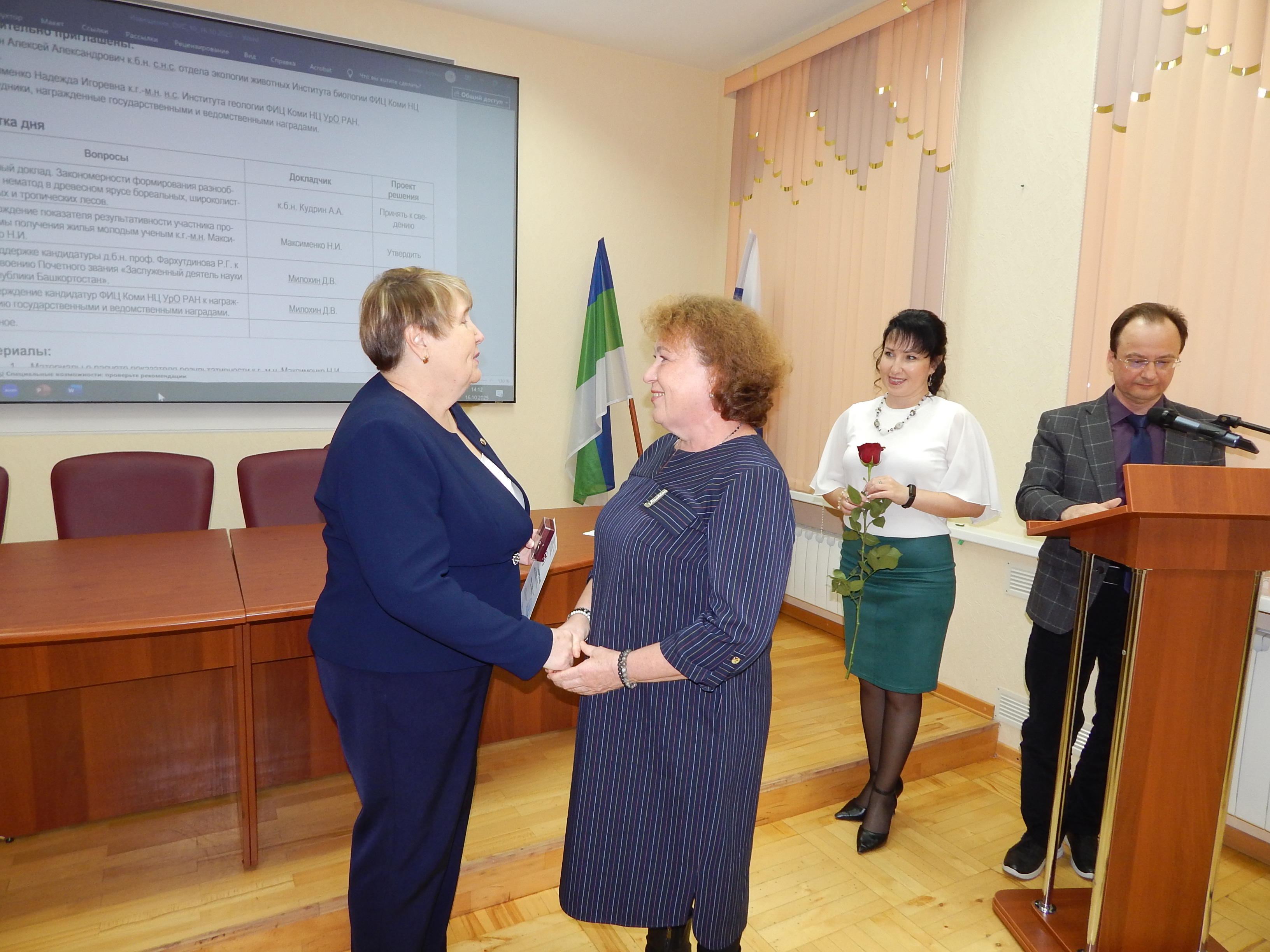 16.10.2025 на заседании Объединенного ученого совета ФИЦ Коми НЦ УрО РАН директор ФИЦ Коми НЦ УрО РАН, член-корреспондент РАН, д.б.н. Светлана Владимировна Дёгтева в торжественной обстановке вручила государственные и ведомственные награды.