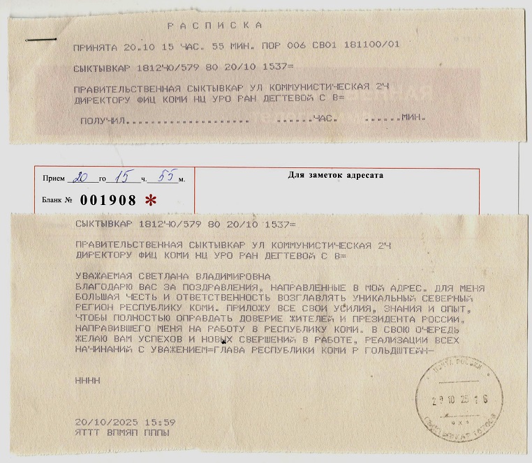 поступила Правительственная телеграмма от Главы Республики Коми Р.Э. Гольдштейна
