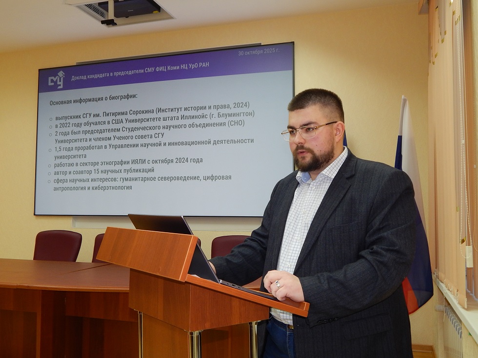 30 октября 2025 года в ФИЦ «Коми научный центр УрО РАН» состоялось знаковое событие — заседание Объединенного Совета молодых ученых (СМУ), на котором был избран новый председатель. Им единогласным решением членов Совета стал Юрий Васильевич Поляков, старший лаборант-исследователь Института языка, литературы и истории.
