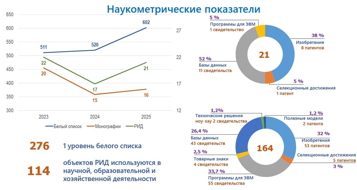 В 2025 году учеными опубликовано 704 статьи в рецензируемых журналах. Прослеживается четкий приоритет качества: 602 работы включены в «Белый список» (ЕГПНИ), из них 276 — в изданиях первого уровня. Вышли в свет 16 монографий и 5 учебников.
