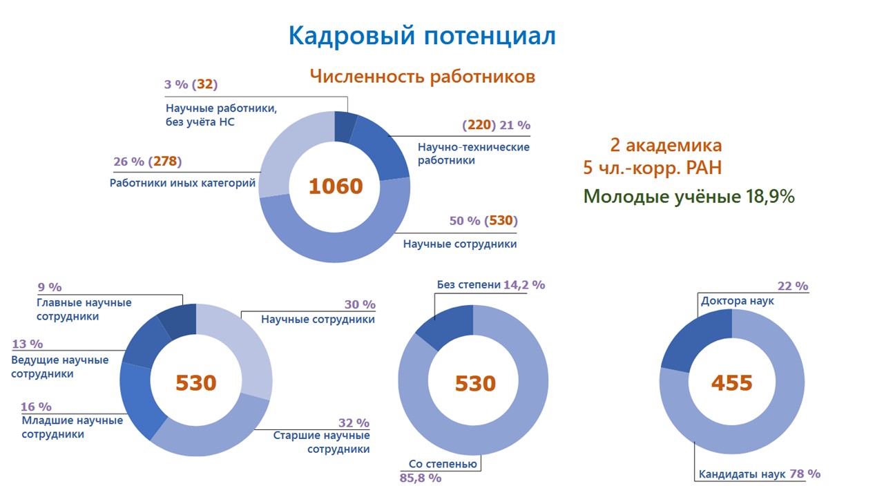 - В штате работают 101 доктор наук (включая двух академиков, пять членов-корреспондентов РАН и одного профессора РАН) и 354 кандидата наук.